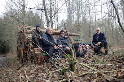 Vi er frokosttrængende, men fortsætter. Hvor asfaltvejen drejer skarpt til venstre, drejer vi til højre og følger markvejen langs fyrretræerne rundt til venstre og derefter til højre over Hundstrup Å. Ret derefter finder vi en solplet med læ ved en stak sten, passende til frokostpausen.
