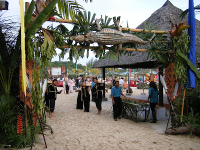 Personalet på resortet havde arbejdet på forberedel- serne til den store nytårs galla middag i en hel uge. Temaet var Borneo Nite og 700 mennesker skulle bespises og underholdes. Der var dækket op på stranden med runde borde, der var scene og borde til buffeter og barer hele vejen rundt. (På billedet peger Ed på det sted, hvor vi skal sidde senere den aften).