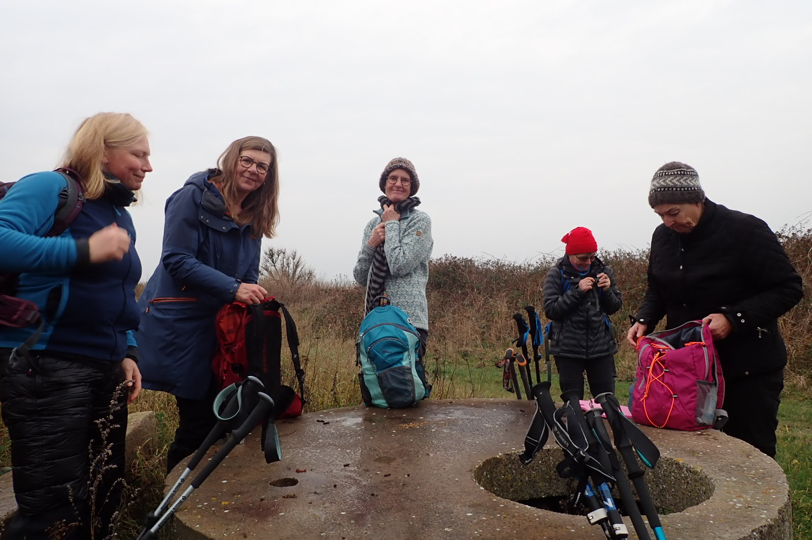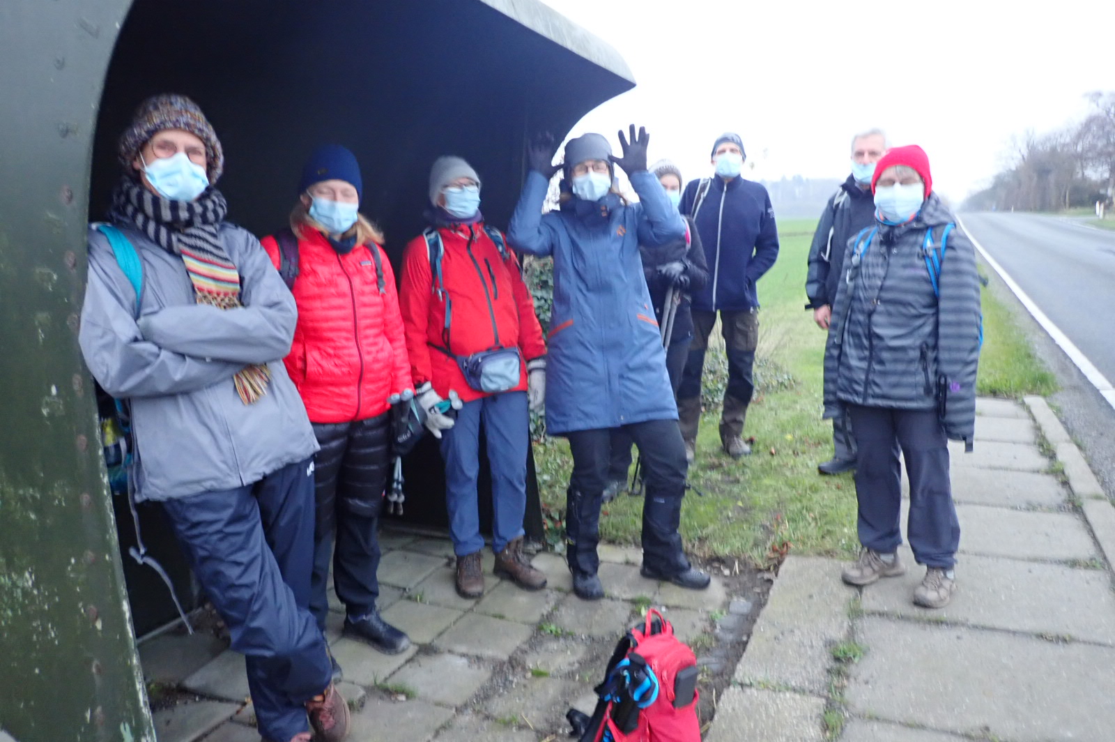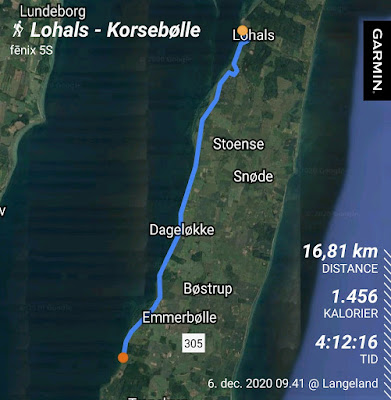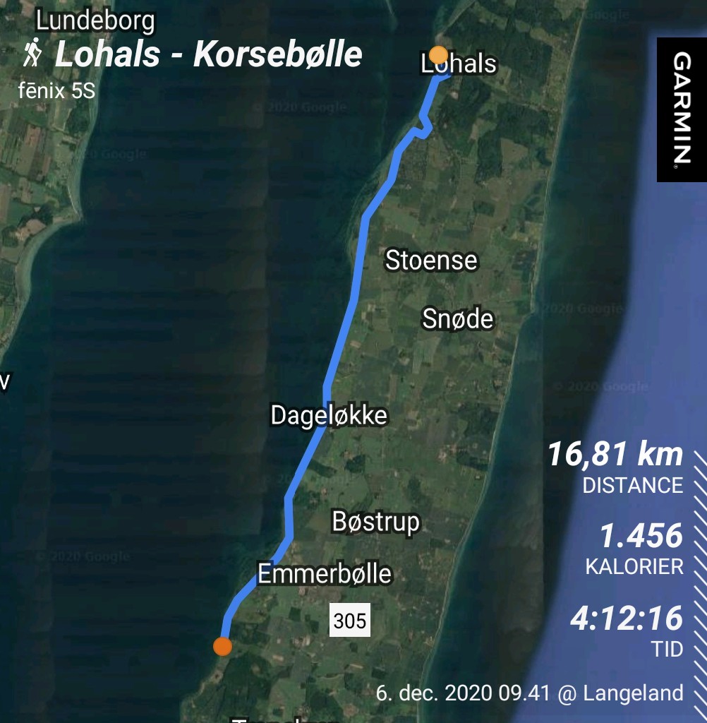 Den 6. december 2020 tog vi den syvende af de 10 etaper Langeland rundt. Vi var 9 friske vandrere, der mødtes under broen til Tåsinge. Her fordelte vi os i tre biler og kørte til Tranekær Slotsmølle. Her blev passagererne sat af og chaufførerne kørte videre til Korsebølle Strand og parkerede de to af bilerne. Den tredje bil returnerede til møllen med chaufførerne. Herfra gik vi de 800 m ned til busstoppestedet og ventede på bussen til Lohals. På søndage afgang kl. 9.14 og 11.14.
