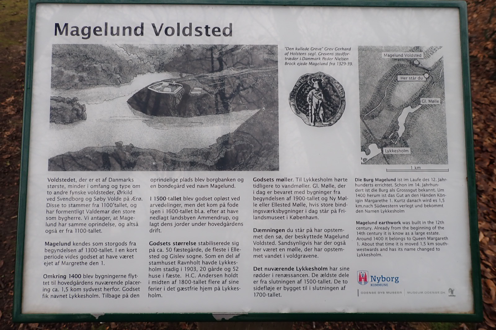 Det ser ud til, at man kan skyde genvej ved den sorte streg. Der er ikke en sti på kortet, men der var tydelige stier fra begge sider, kunne vi se, da vi passerede. Man kan også gå op til vejen ved møllen og gå ned til Voldstedet og dermed undlade det sidste stykke rundt gennem skoven. Endelig kan man også følge enten den røde eller den grønne rute. Se Visit Nyborg for mere info.